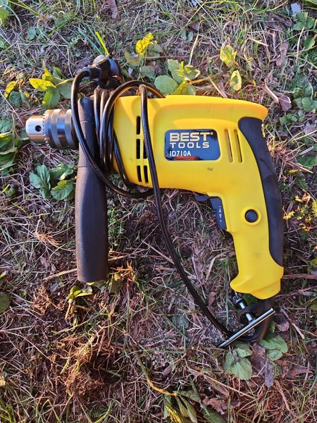 Borrmaskin från BEST TOOLS, modell ID710A. Maskinen är gul och svart med en svart elkabel lindad runt sig. Den har ett extra handtag för bättre grepp.