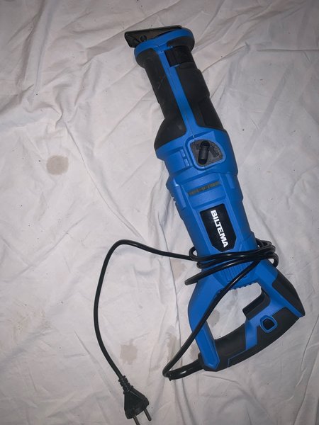 Tigersåg från Biltema i blått och svart. Strömkabel med stickkontakt ingår.