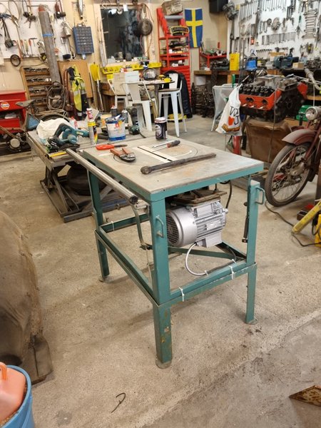 Arbetsbänk med en monterad motor. Bänken har en robust konstruktion och är lämplig för verkstadsbruk.