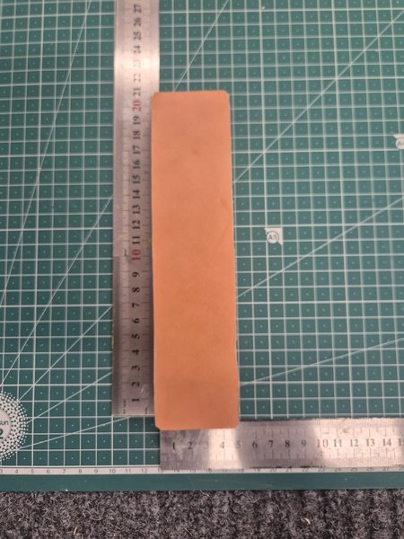 En strigel i MDF med vegatbiliskt garvat beige läder. Blanka sidan uppåt.