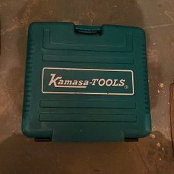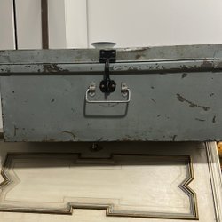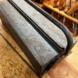 En klassisk verktygslåda i metall. Mått: Längd ca 39 cm, bredd ca 15 cm, höjd ca 21 cm.