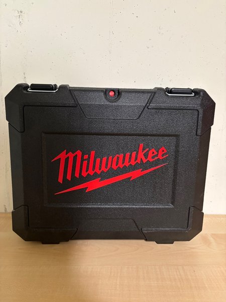 Svart förvaringslåda från Milwaukee med röd logotyp. Lådan har två spännen för att säkra innehållet.