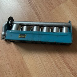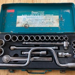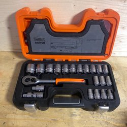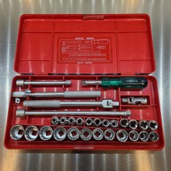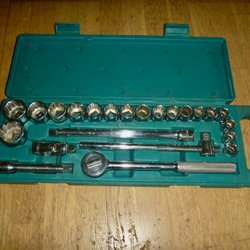 Hylsnyckelsats i en svart metallåda. Perfekt för diverse mekaniska arbeten.