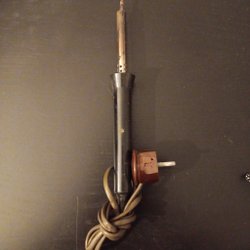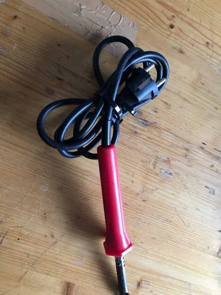 Lödpenna med rött handtag och svart sladd. Sladden är ihoprullad och säkrad med buntband. Stickkontakten är av europeisk standard.