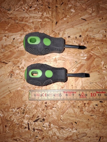 Två skruvmejslar med korta skaft. En spårskruvmejsel och en stjärnskruvmejsel.