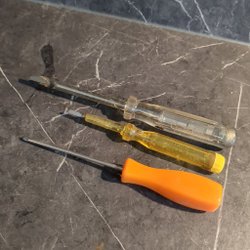 Två skruvmejslar med platt skruvspets och handtag i plast.