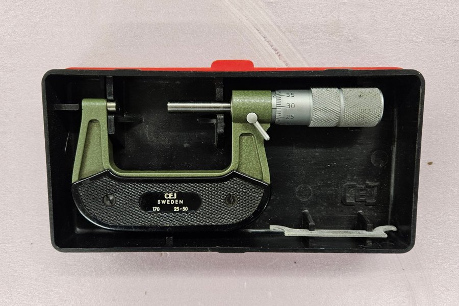 Mikrometer från CEJ, tillverkad i Sverige. Mätområde 25-50 mm. Levereras i originalförvaringslåda.