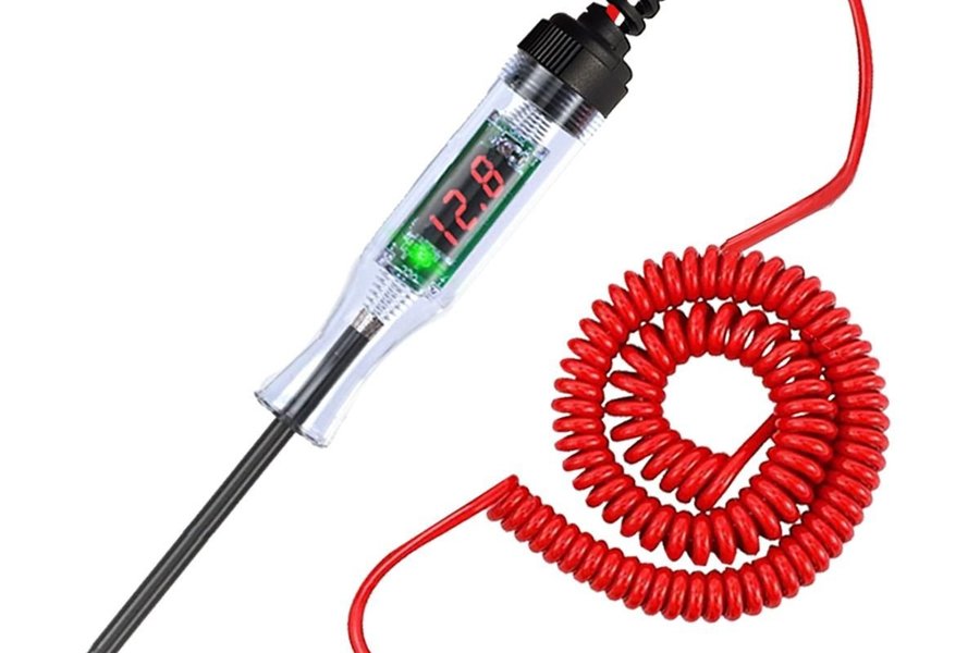 Denna bilspänningstestare är utrustad med en digital display som visar spänningsvärden. Den har en spetsig sond för enkel åtkomst till testpunkter och en spiralkabel med en krokodilklämma för anslutning till jord. Verktyget är utformat för att testa elektriska kretsar i fordon båtar mc m.m.