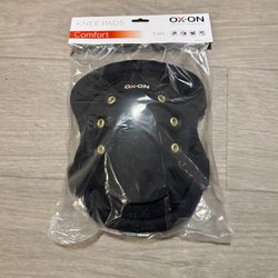 Ett par knäskydd. Märkta med "This side towards knee" på ena sidan och "Helly Hansen" på andra sidan.