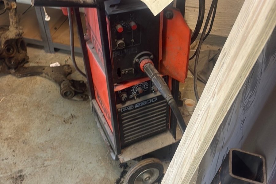 Svets av märket ESAB, modell PS 2800. Enheten är orange och svart med hjul för enkel förflyttning. Den har en kontrollpanel med rattar och anslutningar på framsidan. Saknas en gjord kabel