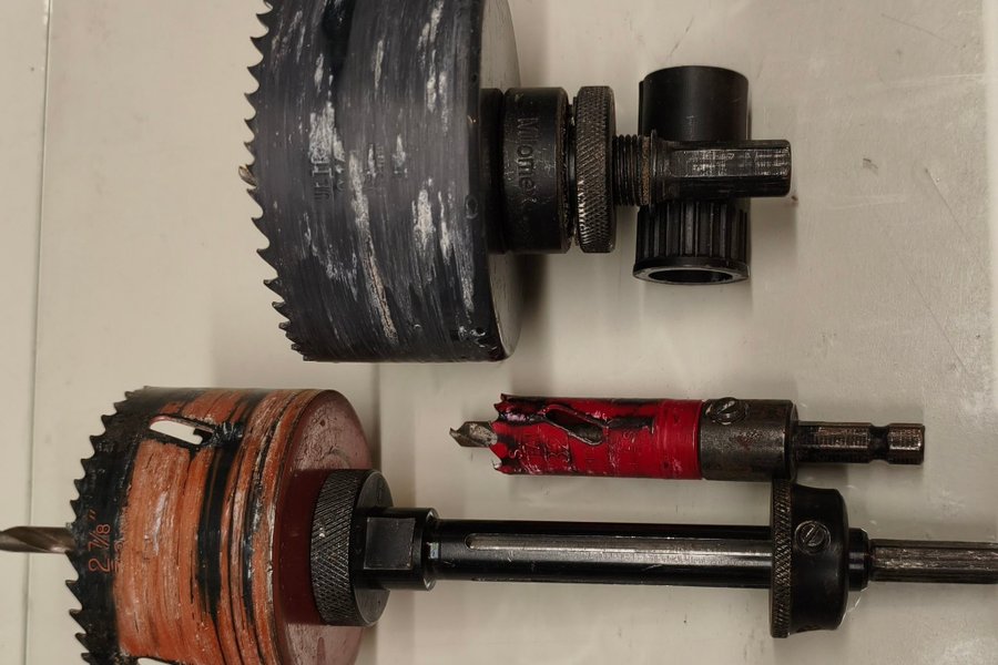 Hålsågar i olika storlekar med tillhörande fästen.