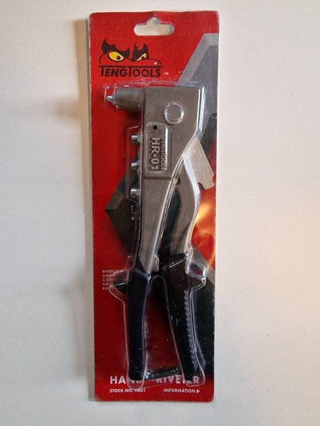 En ny Tengtools HR-01 handnitare. Denna nitare använder nitar i storlekarna 2.4mm, 3.2mm, 4.0mm och 4.8mm.