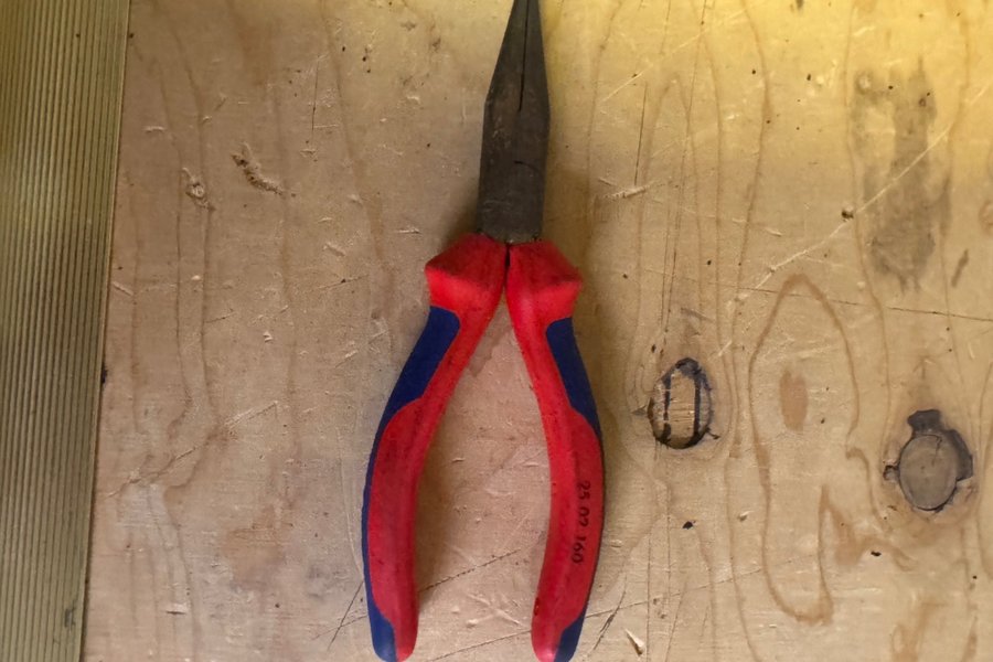 Spetstång med röda och blå handtag. Tången har texten "25 02 160" på ena handtaget.