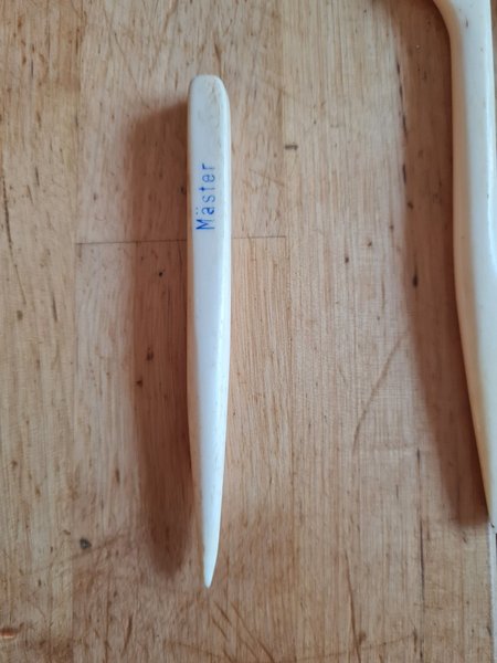 Ett falsben i benmaterial med texten "Mäster" ingraverad. Falsbenet är spetsigt i ena änden och avrundat i den andra. 9cm