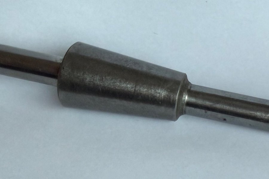 En Balanseringsdorn för slipskivor med nav. Total längd 148 mm, Axeldiameter 12,2 mm, Konans längd 45 mm, största diameter = 26 mm, konans hela vinkel = 10°.