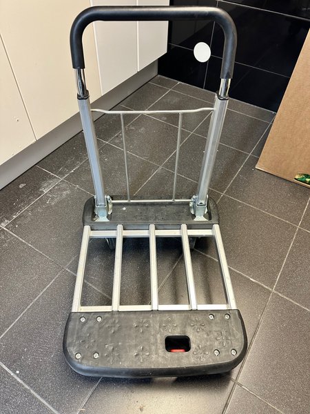 Säckkärra i aluminium med svart handtag och svart fotplatta. Det går att vika ner och ihop