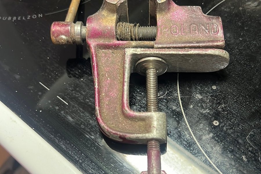 Ett bordskruvstycke märkt ”POLAND” på sidan. Skruvstycket har en rödaktig färg och en vev för att justera öppningen samt en klämskruv för att fästa det vid en yta.
