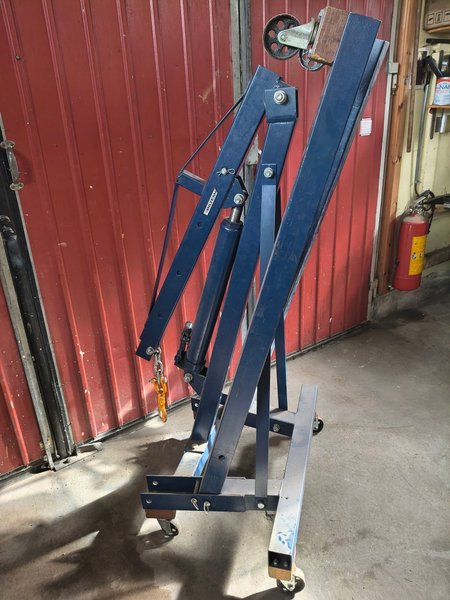 Motorlyft / verkstadskran med hjul för enkel förflyttning. Utrustad med en hydraulisk cylinder och en kedja med krok för lyft. Perfekt för verkstaden eller garaget.