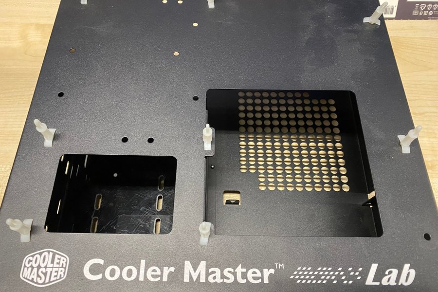 Cooler Master Lab PC-chassi i svart. Chassit har utskärningar för komponenter och ventilationshål. Cooler Master Lab-logotypen finns på sidan.
