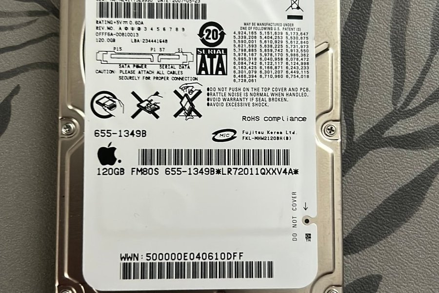 Fujitsu hårddisk med en kapacitet på 120 GB. Modellnummer CA06820-B38800AP. Tillverkad den 23 maj 2007. Serienummer NZ4117529950. Hårddisken har SATA-gränssnitt.