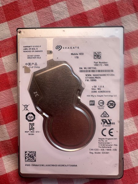 Seagate Mobile HDD med en kapacitet på 1TB. Modellnummer ST1000LM035. Tillverkad av Seagate Technology LLC. Serienummer: WL1M7Y9Q. Part Number: 1RK172-568. Tillverkningsdatum: 02NOV2018. Reg. Model: SDC001.