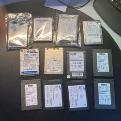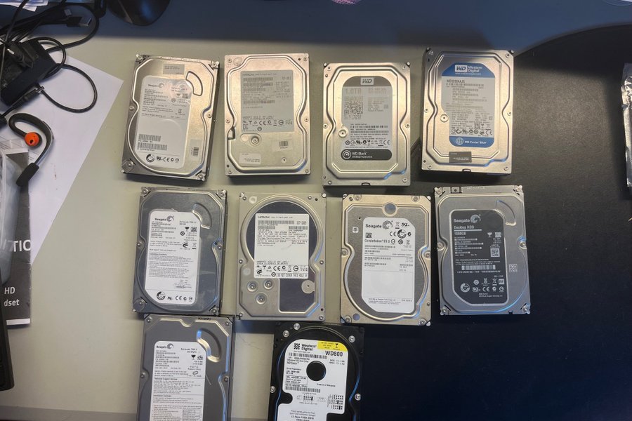 Diverse hårddiskar. Inkluderar märken som Seagate, Western Digital och Hitachi.