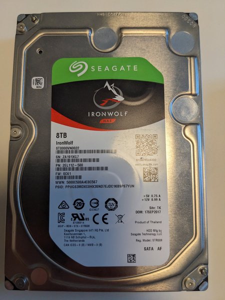 Seagate IronWolf NAS hårddisk med en kapacitet på 8TB. Modellnummer ST8000VN0022. Serienummer ZA191XG7. Produktnummer 2EL112-500. Firmware SC61. Tillverkad 17 september 2017 i Thailand. Använder SATA AF-gränssnitt.