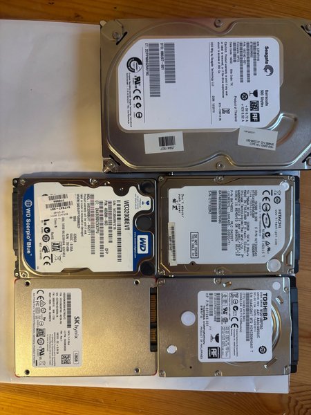 Hårddiskar från olika tillverkare. En Seagate Barracuda på 500 GB, en WD Scorpio Blue WD3200BEVT på 320 GB, en Hitachi HTS545032A7A380 på 320 GB, en SK Hynix SSD på 128 GB och en Toshiba MQ01ABF050 på 500 GB.