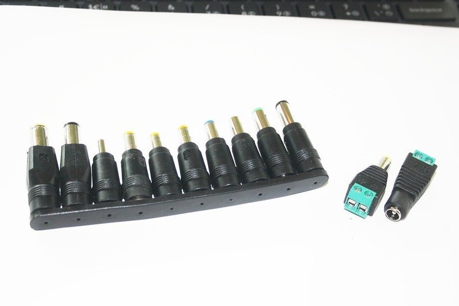 Detta kit innehåller 8 DC-strömkontaktadaptrar och 2 skruvterminalkontakter. Adaptrarna är designade för att ge flexibilitet vid anslutning av olika enheter.