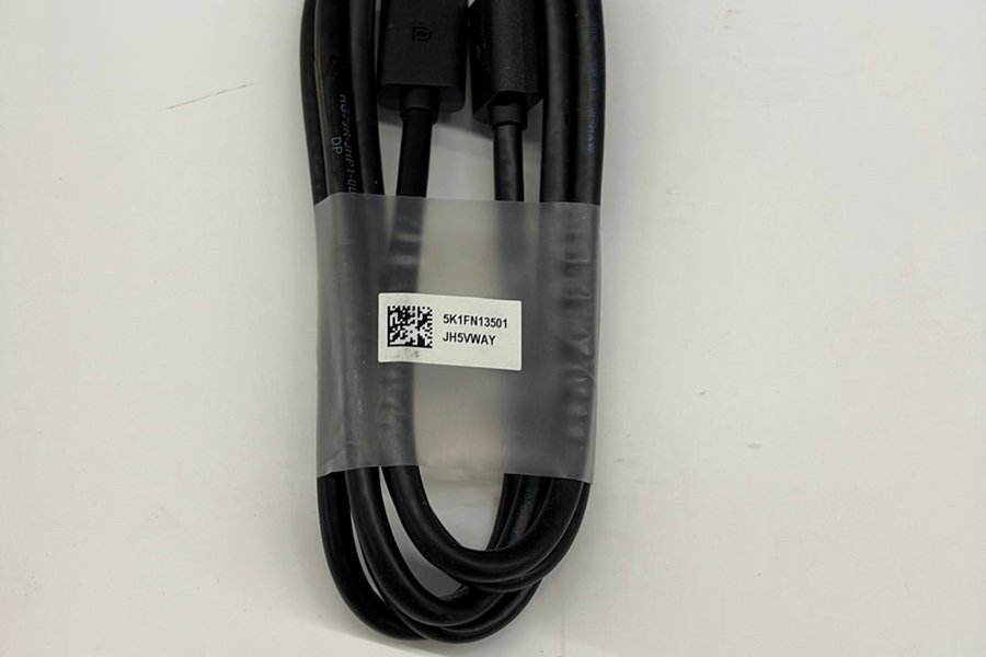 Svart kabel med DisplayPort-kontakt i ena änden och USB-kontakt i den andra. Kabeln är lindad och säkrad med en plastrem. På plastremmen finns en etikett med texten "5K1FN13501" och "JH5VWAY" samt en QR-kod.