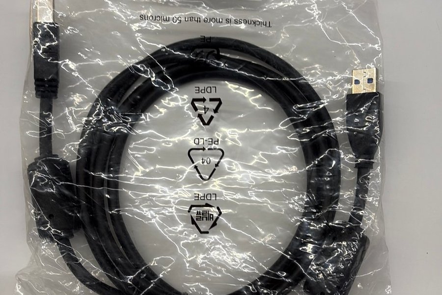 Svart USB-kabel för anslutning av olika enheter. Kabeln är förpackad i en plastpåse.