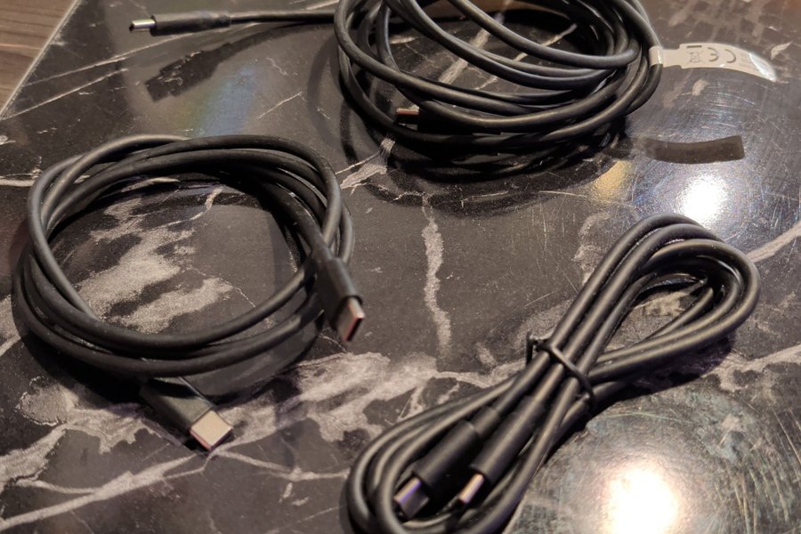 Tre svarta USB-kablar. Alla tre kablarna har USB-C-kontakter i båda ändar.
