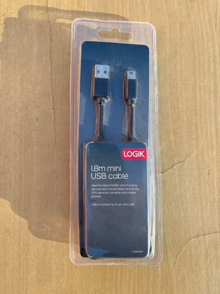 Logik 1.8m mini USB-kabel för dataöverföring och laddning. Kabeln är idealisk för enheter som bärbara hårddiskar, GPS-enheter, kameror och mobiltelefoner. Den ansluter USB A till 5-pin mini USB.