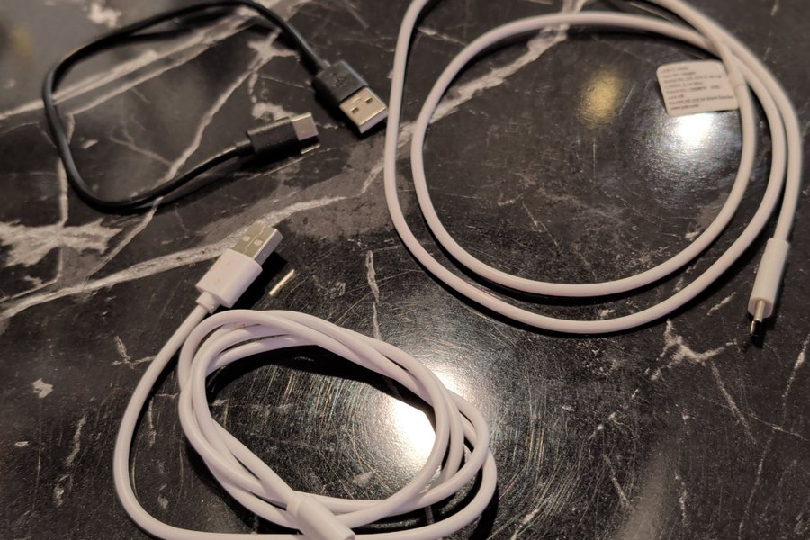 Tre USB-kablar för laddning och dataöverföring. Samtliga har USB-A i ena änden och USB-C i andra. Två vita och en svart.