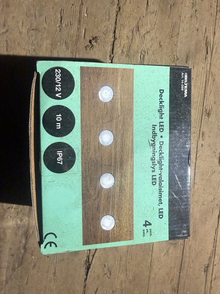 Decklight LED från Biltema, artikelnummer 14-099. Dessa infällda LED-lampor är designade för utomhusbruk med en IP67-klassning, vilket garanterar skydd mot damm och vatten. De drivs med 230/12 V och har en kabellängd på 10 meter. Förpackningen innehåller 4 stycken lampor. Nya.