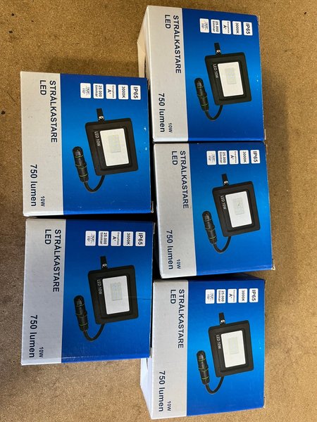 5 stycken LED Strålkastare med 10W effekt och 750 lumen ljusstyrka. Färgtemperaturen är 3000K. Strålkastaren har en livslängd på 25 000 timmar och en spridningsvinkel på 110°. Den är klassad med energiklass A+ och har ett IP65-skydd.