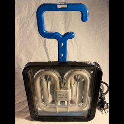 Arbetslampa med handtag och stativ. Lampan har en svart ram och ett gult stativ. Strömkabel med stickkontakt ingår. Fullt fungerande.