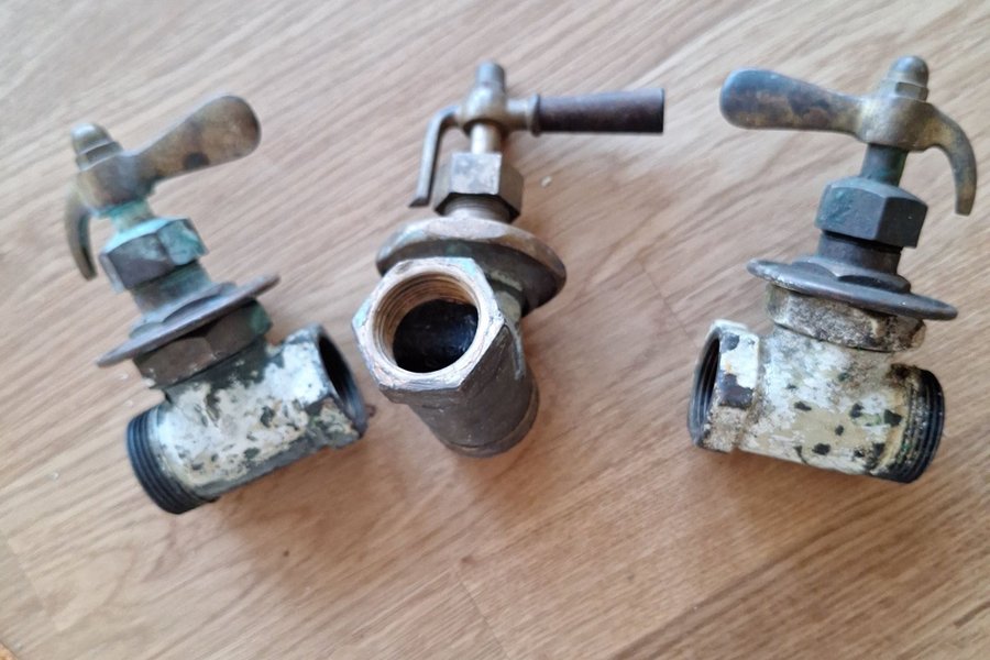 Tillverkade i mässing. Vreden på två av dem fungerar, men ej funktionstestade. Vreden på den i mitten sitter fast.