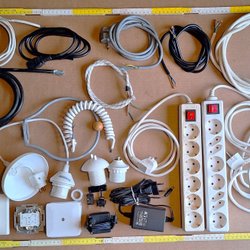 Ett sortiment av olika el-komponenter. Inkluderar bland annat lampproppar, takdoslock, vägguttag och andra tillbehör för elinstallationer. Perfekt för den som behöver reservdelar eller vill bygga egna lampor och elsystem.