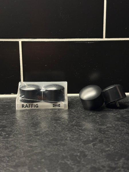 IKEA Raffig knoppar i svart färg. Dessa knoppar är lämpliga för att ge dina gardiner ett nytt utseende.
