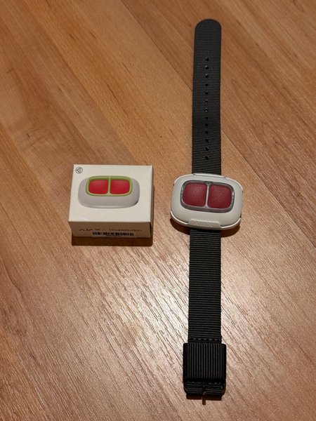 Ajax DoubleButton är en enhet med två röda knappar. Den är vit till färgen. Enheten är monterad på en svart handledsrem.