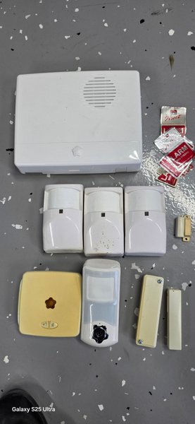 Larmdelar från Verisure. Inkluderar detektorer, centralenhet och dörrkontakter.