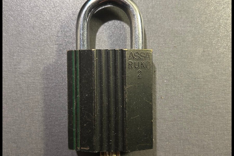 Ett hänglås av märket ASSA RUKO klass 2. En nyckel medföljer. Nypris över 2000 kr.