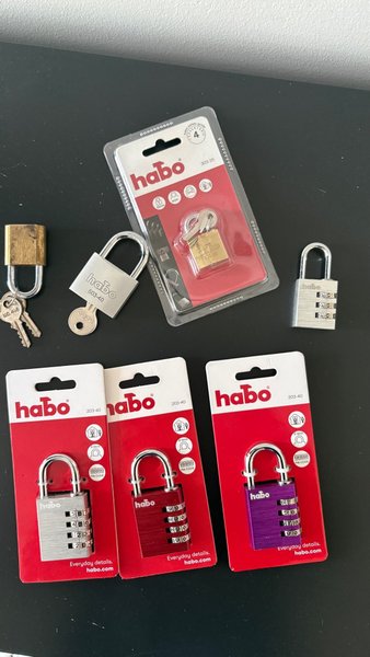 Ett parti med hänglås i olika utföranden. Innehåller hänglås med nyckel och kodlås i färgerna silver, röd och lila. Även ett mindre mässingsfärgat hänglås med nyckel ingår.