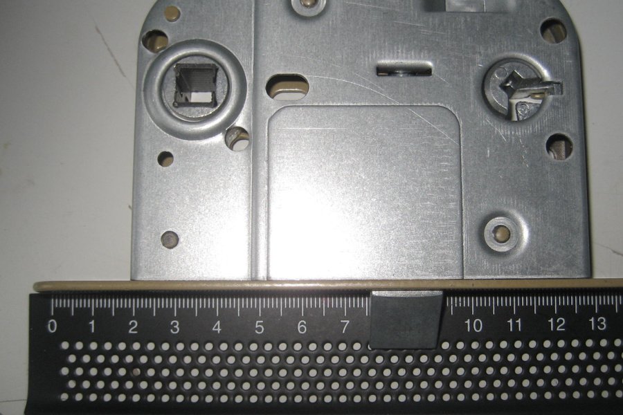 Mäter cirka 13 cm i bredd och 8 cm i höjd. Observera måtten för kolvens placering i förhållande till det låsbleck du använder.