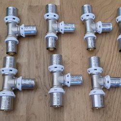 Två förkromade klämringskopplingar för 22mm kopparrör Används för att koppla ihop rör i vinkel.