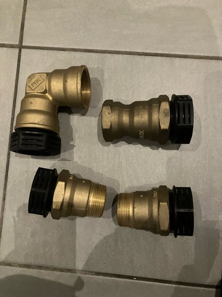 PRK-kopplingar i mässing. En 90-graders vinkelkoppling och tre raka kopplingar. Storlek 40 ej andvända