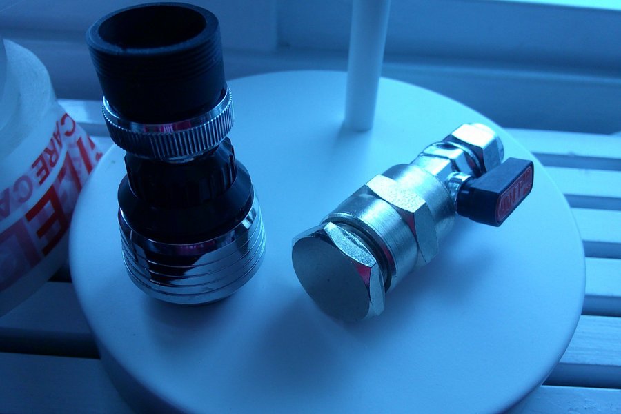 Ett kranfilter och en kulventil i metall. Kranfiltret är svart och silverfärgat. Kulventilen är silverfärgad med ett svart handtag.