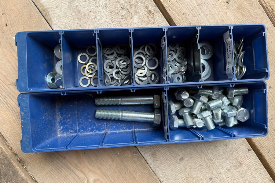 En samling av bultar och brickor i olika storlekar. Innehåller både större bultar och ett urval av mindre bultar samt olika typer av brickor, inklusive fjäderbrickor och vanliga brickor. Lådorna följer inte med pga skrymmande.