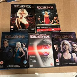 Battlestar Galactica - Säsong 1 på DVD. Följ med när de tolv kolonierna av mänskligheten nästan förstörs i kulmen av ett hundraårigt krig med Cylon Empire. President Roslin och Commander Adama samlar de få människor som finns kvar och ger sig ut på en resa för att hitta den mytiska planeten Jorden. Denna DVD-utgåva innehåller 5 diskar med alla 13 spännande avsnitt av säsong 1 och TV-miniserierna som startade allt.
